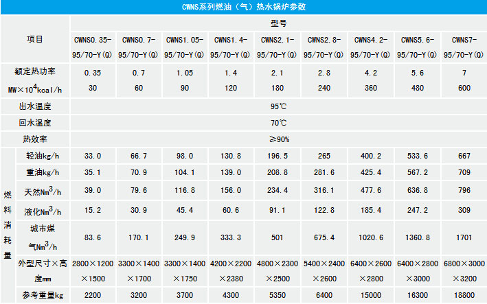 CWNS型燃油(气)热水锅炉为卧式快装内燃三回程火管锅炉。吸收了国际**锅炉**新传热方式,采取**佳外形设计方案,采用偏置炉胆湿背式结构,高温烟气依次冲刷第二及第三回程烟管,然后由后烟室经烟囱排入大气。锅炉装有活动的前后烟箱盖,使锅炉检修方便。锅炉配置技术性能良好的工业燃烧器,采用了燃烧自动比例调节,给水自动调节,程序启停,全自动运行等**技术,并具有高低水位报警和极低水位、超高汽压、熄火等自动保护功能。该型锅炉具有结构紧凑、****、操作简便、安装迅速、污染少、噪音低、效率高等特点。