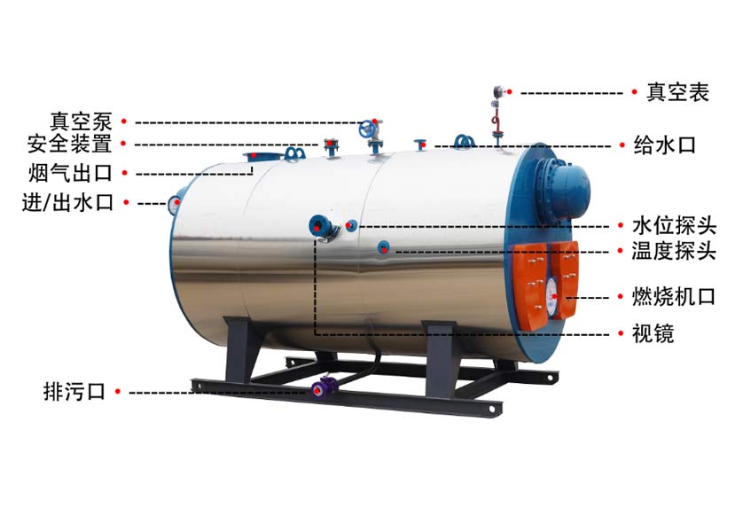 4、燃烧设备:由于真空相变锅炉的特殊设计,根据燃料类型及用户需求,通过专用安装板,可配置各种进口、国产的燃油、燃气燃烧器。